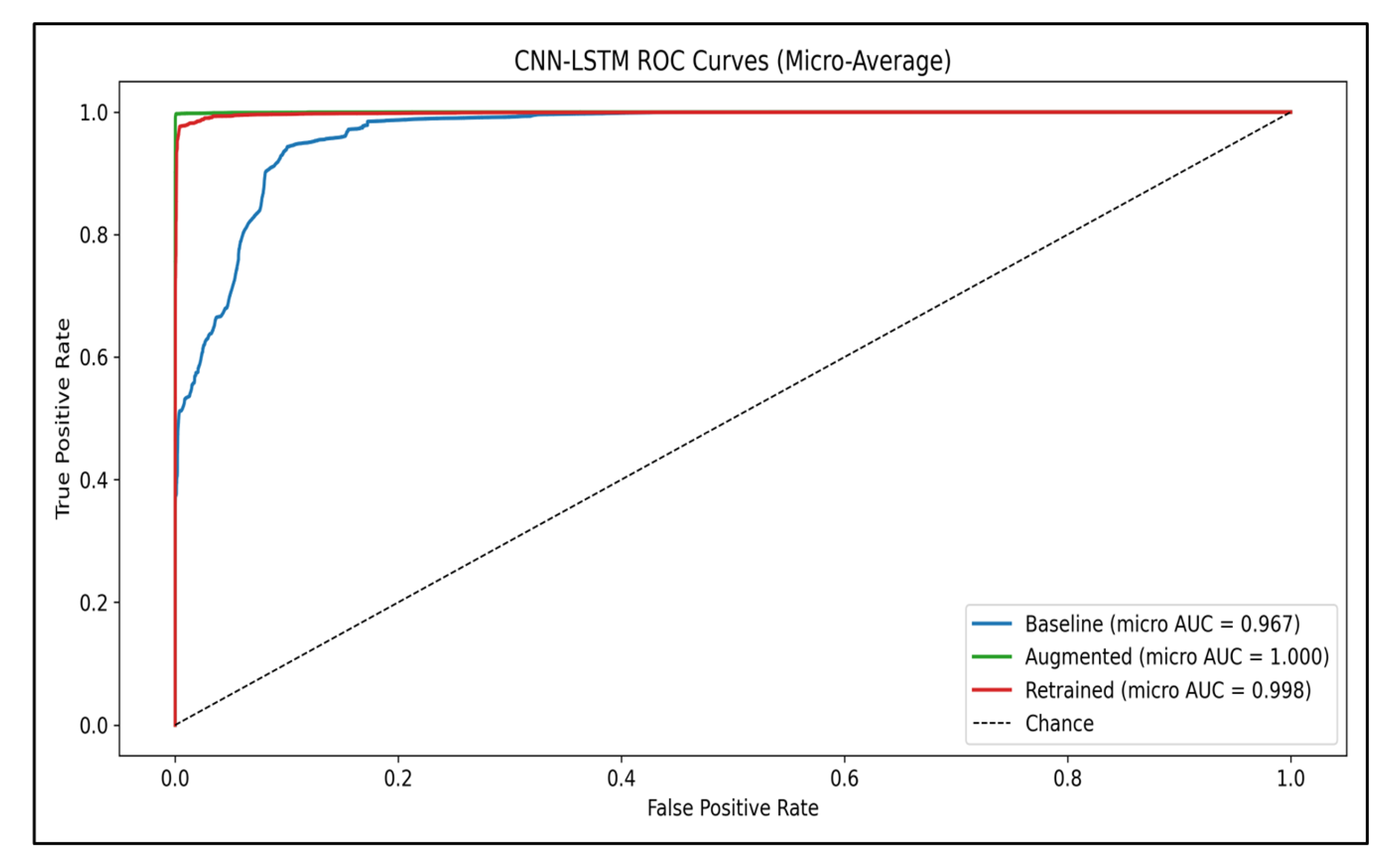Micro-averaged ROC curves for CNN–LSTM across the three stages (baseline, augmented, and retrained). Augmentation lifts the curve to almost perfect separability (AUC = 1.000), and uncertainty-guided retraining retains that performance (AUC = 0.998), whereas the baseline remains high at AUC = 0.967. The dashed line indicates a chance classifier.