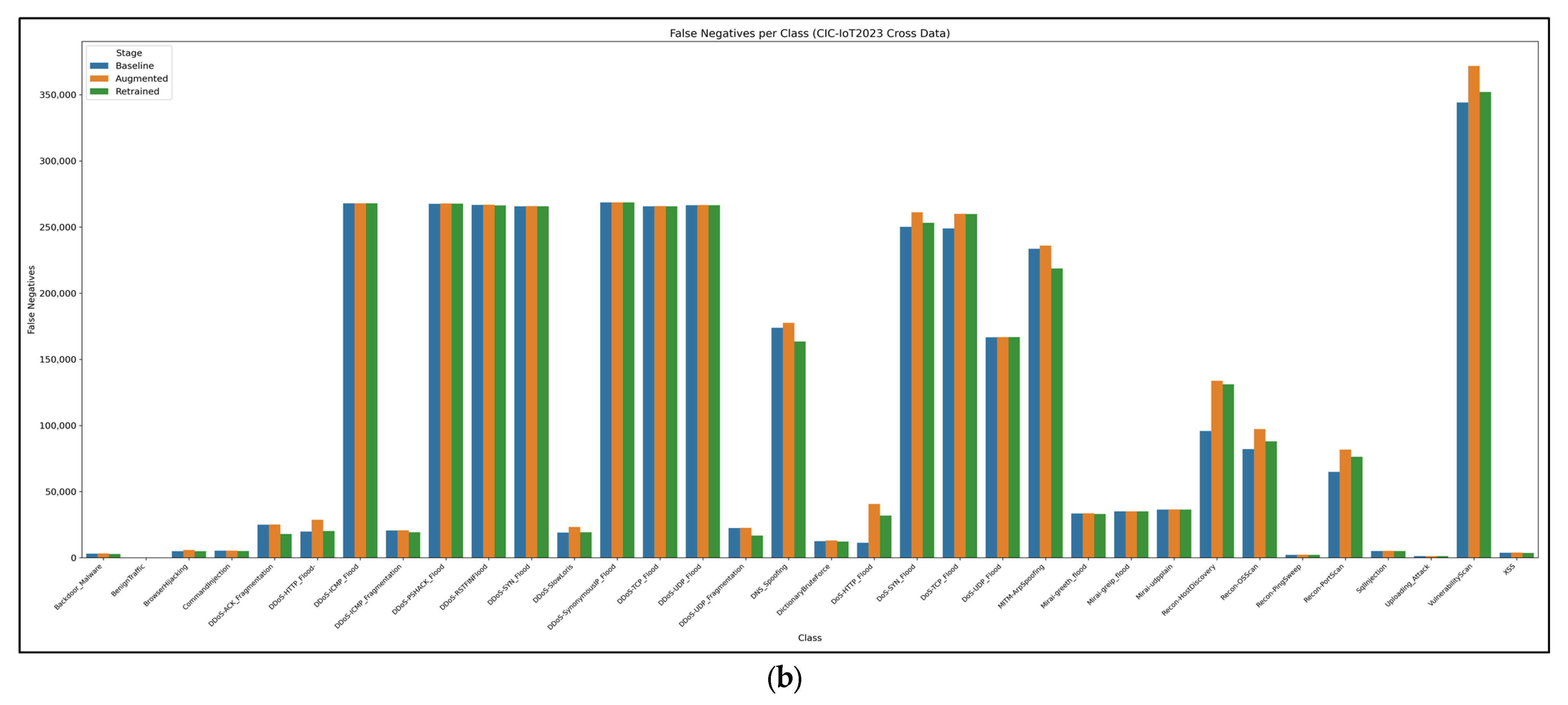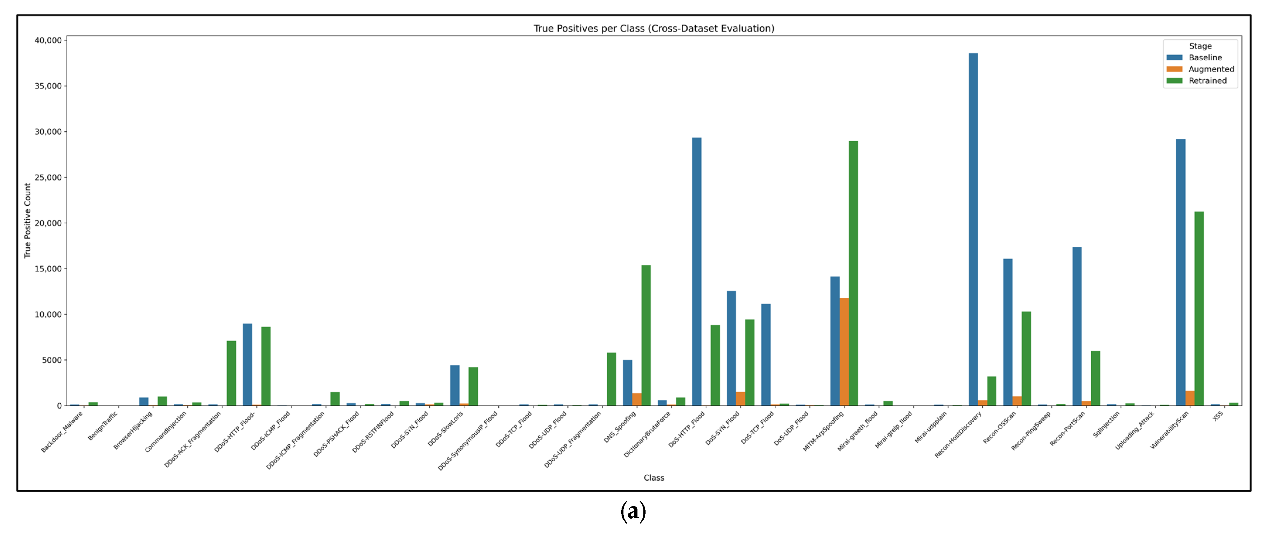 (a) True-positive counts per IoT attack class for the baseline, augmented, and retrained CNN–LSTM stages. (b) Corresponding false-negative counts. Cross-dataset transfer is dominated by a few Mirai/DDoS classes, whereas most IoT-specific malware remains largely undetected, underscoring a severe domain shift.