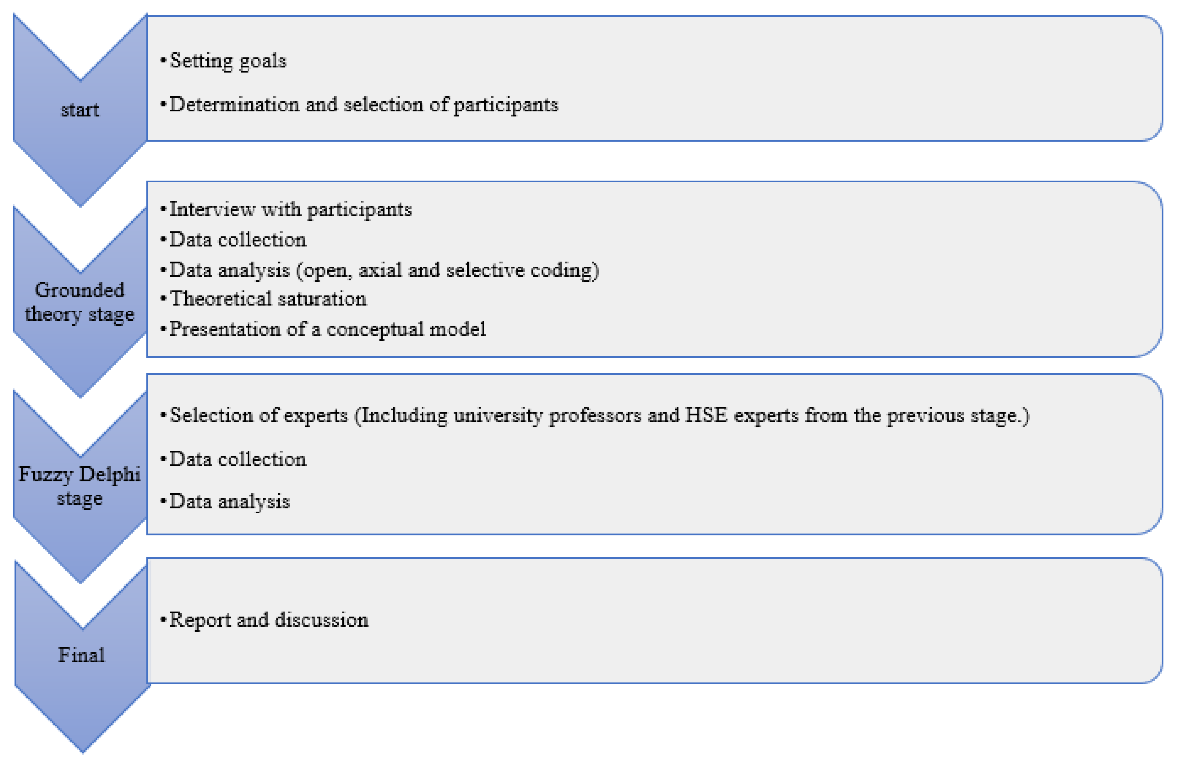 The present study adopts a hybrid qualitative research approach to systematically identify and prioritize individual determinants of unsafe behaviors in industrial workplaces. This approach was selected due to its ability to capture rich, context-specific insights from participants while also enabling structured prioritization of critical factors, which is essential for evidence-based decision-making in occupational safety management. Specifically, the combination of Grounded Theory Method (GTM) and the Fuzzy Delphi Method (FDM) provides both a theory-building framework and a rigorous mechanism for expert consensus under uncertainty.