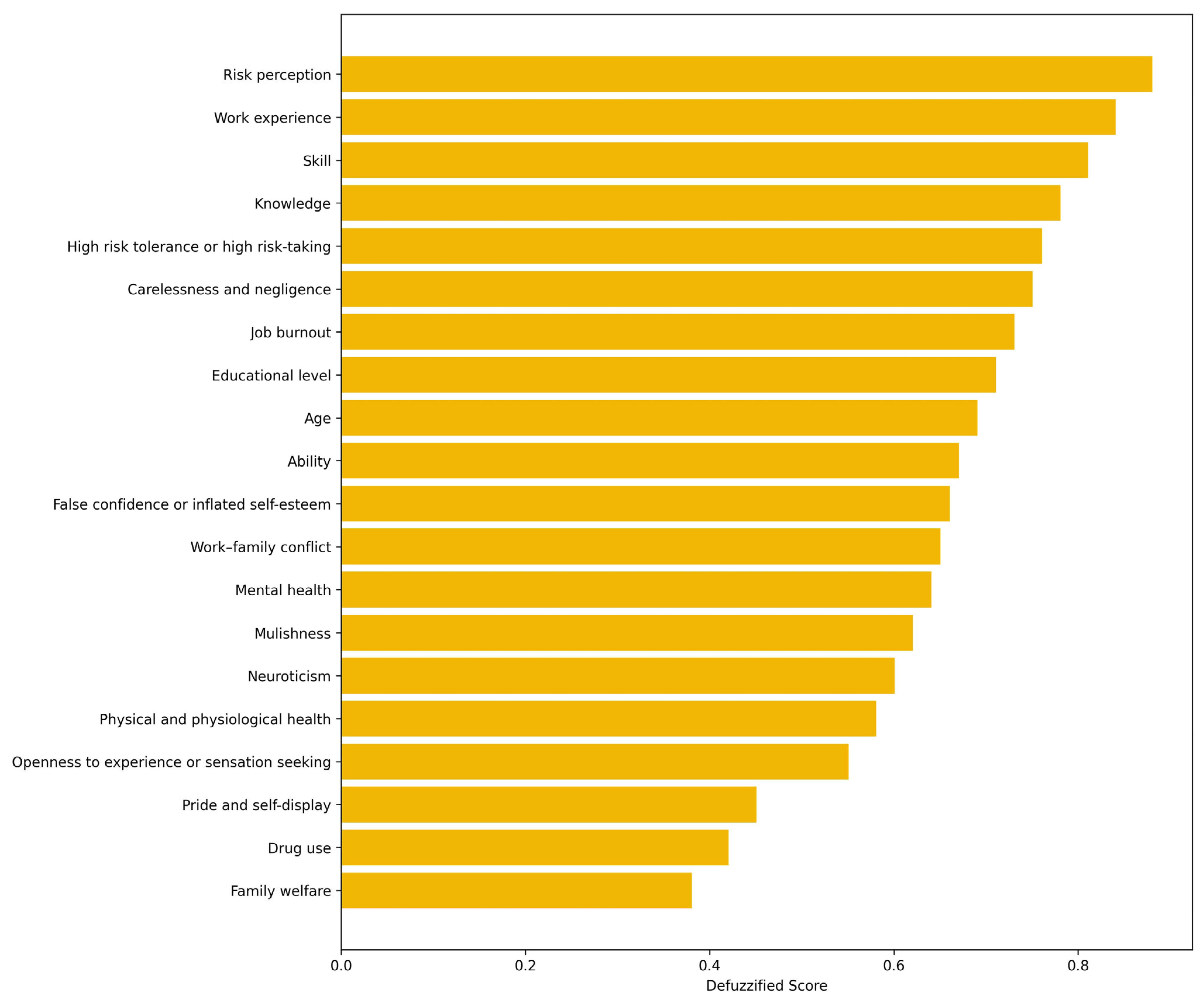 38]. Therefore, factors with defuzzified values below 0.6 were excluded, as they failed to meet the minimum threshold of expert-endorsed relevance to unsafe acts and factors scoring ≥0.6 were retained and ranked in descending order of their defuzzified values, ensuring a focus on the most impactful contributors.