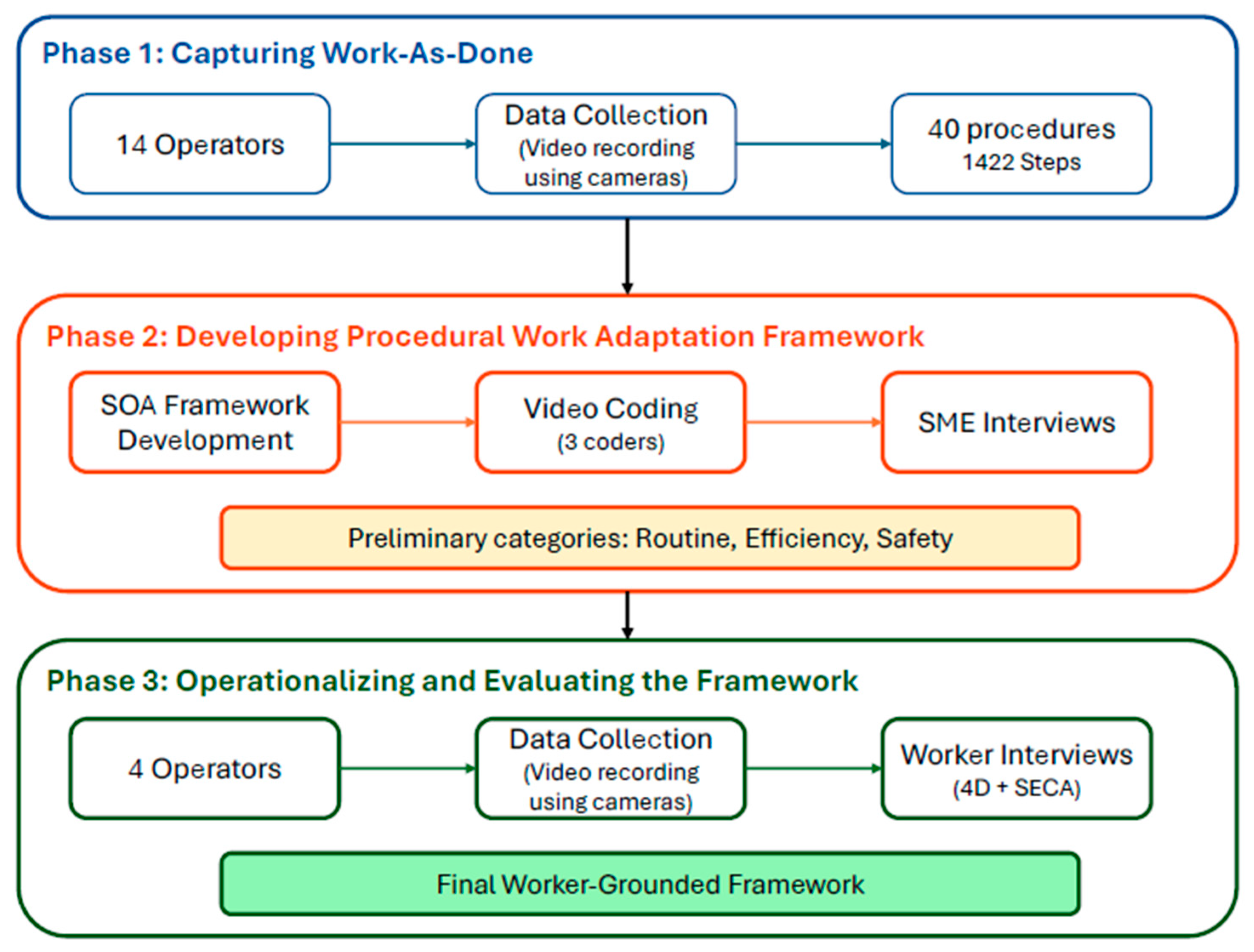 The study consisted of a three-phase research design conducted over five years (2019–2024) at a major petrochemical company in the southern United States (Figure 1). Phase 1 captured behavioral data on procedural adaptations via video observation. Phase 2 documented the variations between WAI and WAD and the different phases of tasks on which adaptations occurred, with expert interpretation revealing why these variations occurred, thereby developing a framework to categorize such adaptations. Phase 3 involved an observational study to evaluate the operationalizability of the framework and to gather worker perspectives. This convergent evidence ensured the framework reflected both observable work practices and worker reasoning.