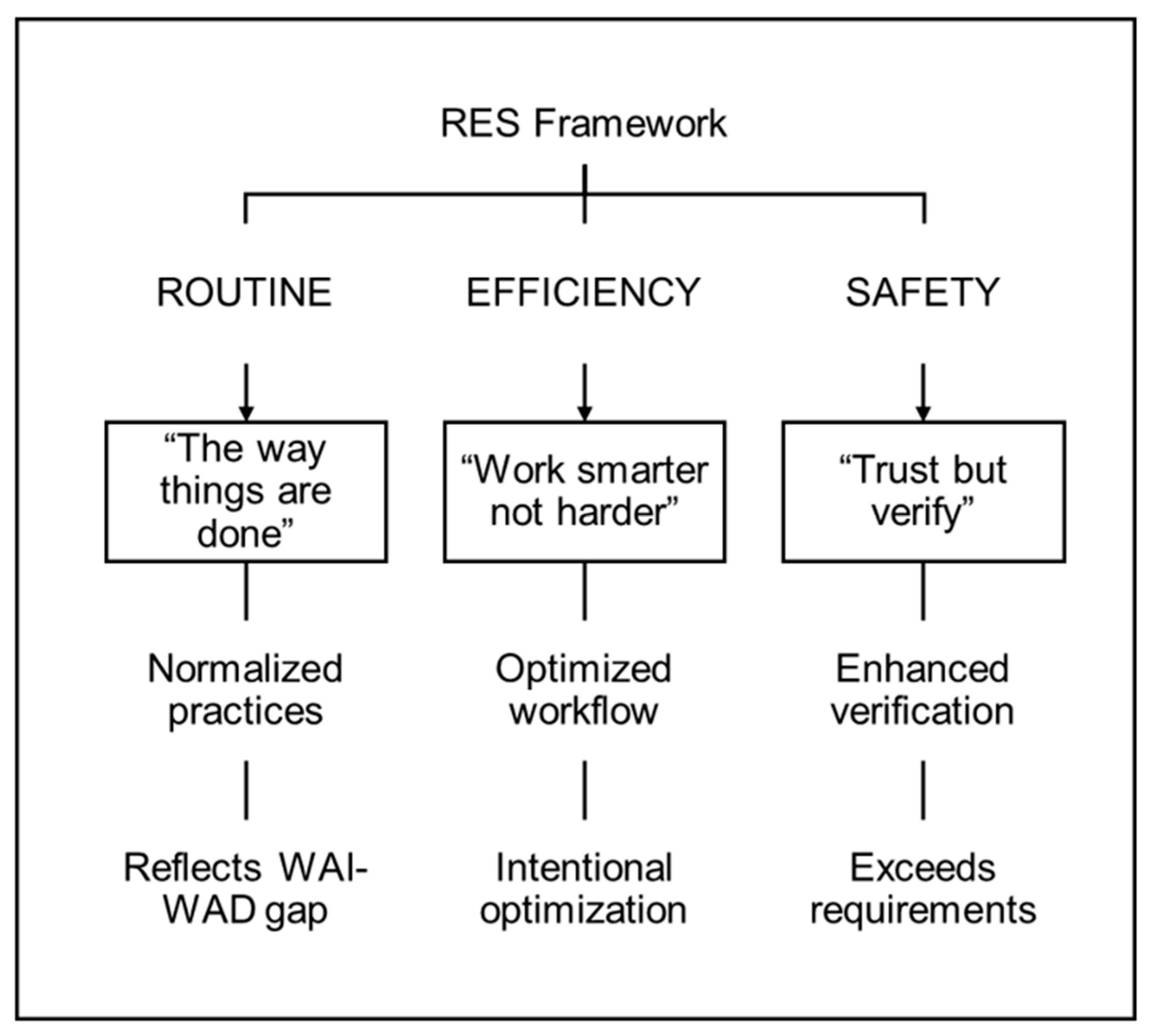 Beyond analyzing failures, recent research has examined the gap between prescribed procedures and actual work practices, reflecting the gap between Work-As-Imagined (WAI) and Work-As-Done (WAD) across healthcare [14,15], organizational dynamics [16], emergency response [17], and petrochemical operations [18]. These studies recognize that differences between prescribed and actual work are inevitable features of complex operations [4]. However, the broader literature on procedural compliance continue to frame these differences between WAI and WAD using language borrowed from human error taxonomies. Terms like “procedural violation,” “non-compliance,” and “deviation” carry negative connotations that obscure the potential benefits of many improvisations and adaptations [19,20,21].