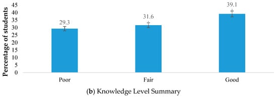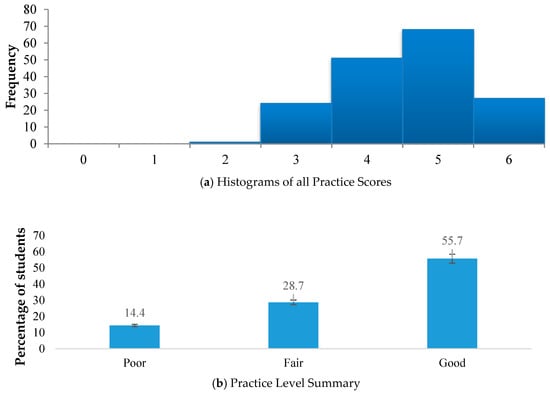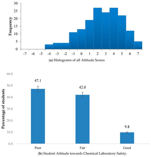 In the assessment of students’ chemical laboratory safety practices, most students revealed a total fair to good practices (84.4%) when in the chemistry laboratory (Figure 3; (a) full histograms for each sore and (b) a summary), this indicates that students follow the proper safety rules inside laboratories. This result might be explained by the fact that strict rules are applied to students enrolled in chemistry laboratories. Students are not allowed to enter chemistry laboratories without wearing personal protective equipment, and that chemicals are kept in the fume hoods, so students are not allowed to carry them to their benches. There are statistically significant differences among the score means of students who displayed poor, fair or good practices. There was no overlap in the interval error bars at 95% confidence.