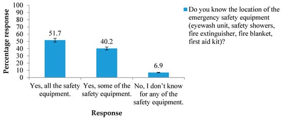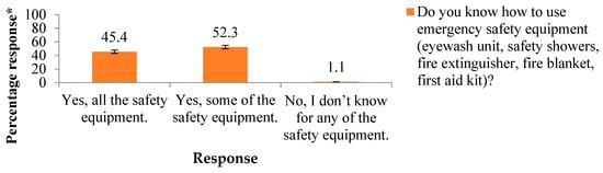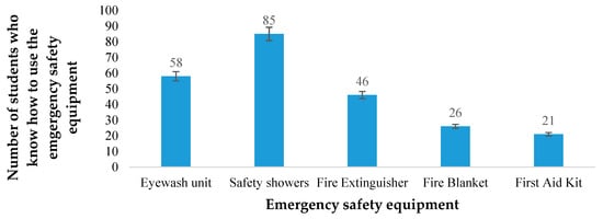 Usually, students receive an orientation session on the location of all emergency equipment during the first week of the course. As in any university, the first week might be the “drop and add week” for students to confirm their registration status in the chemistry laboratory courses. Hence, many students may miss the safety and emergency equipment orientation. This highlights how important it is for the university to guarantee a compulsory safety orientation session, even for those students who miss the first week due to registration arrangements, in order for them to know the location and the proper usage of the emergency equipment based on the university policy for risk management. Approximately half of the students indicated that they know the location of all the emergency equipment in the Chemistry laboratory while the remaining 47.1% did not (Figure 5).