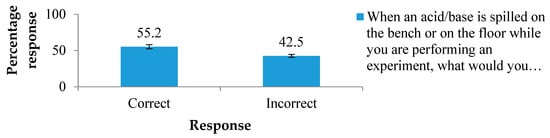 Reviewing the responses of students to dealing with chemical spills, only 55.2% of the students are aware of the correct procedure to be used to clean up a spilled acid or base on the laboratory bench or floor, while approximately half of the other students did not know how to react in the case of chemical spills (Figure 8). This indicates a weakness of how students can deal with such emergency incidents, which can be explained by the fact that spill kits are unavailable in these chemistry labs as well as the lack of knowledge and awareness of the potential health and environmental hazard of the improper handling of such situations, which should be addressed in the curriculum.