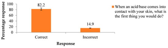 In emergencies where chemicals come in contact with skin or eyes, the majority of students (82.2%) were aware of the correct procedure to be followed when an acid or base comes into contact with their skin (Figure 9). This high awareness percentage can be attributed to the fact that students are informed during the orientation session and reminded regularly on how to react in such a situation in a proper way.