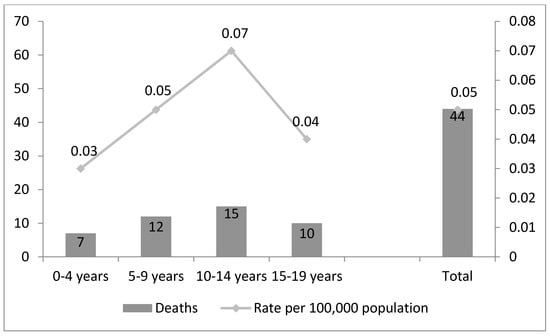 When examining flood-related fatal drowning among children and adolescents by age group, the largest proportion of drowning deaths involved those aged 10–14 years (34.1%). When examining drowning rates, the 10–14 years age group also recorded the highest rate at 0.07 per 100,000 population, compared to 0.03 per 100,000 population among those aged 0–4 years (Figure 1).