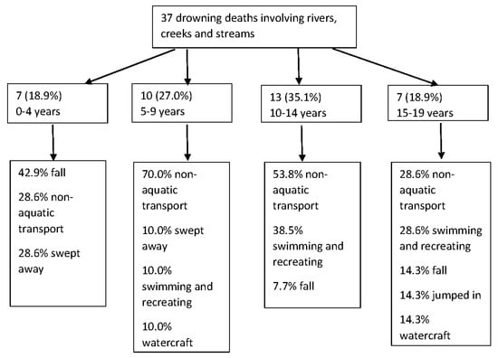 Flow chart exploring river flood related child and adolescent drowning deaths, activities presented in rank order, 0–19 years by age group, Australia, 2002/03–2017/18 (n = 37).