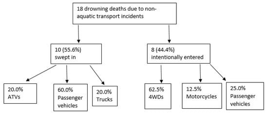 Multiple fatality events (MFEs) are defined as such where more than one person drowns in the same incident. All Terrain Vehicles (ATVs), also known as quad bikes, are generally three- or four-wheel vehicles that travel on low-pressure tires, with a seat that is straddled by the operator, along with handlebars for steering control. ATVs are used extensively in agriculture and for trail riding for recreation []. A 4WD (also known as a 4 × 4) is a two-axled vehicle capable of providing torque to all of its wheels simultaneously.
