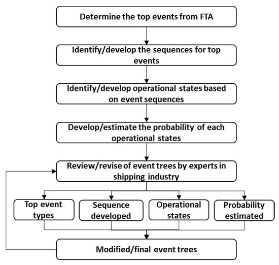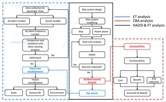 A formal safety assessment (FSA) is a risk assessment approach approved by IMO to evaluate the risks associated with shipping industry as well as to determine the cost and benefits of risk control options (RCOs) to reduce the potential risks []. It comprises six steps as shown in Figure 1. In this study, Step 1 will be supported by HAZID in Section 2.2; Step 2 will be provided in fault tree (FT) and event tree (ET) in Section 2.3 and Section 2.4; the approach of cost-benefit assessment will be presented in Section 2.4.