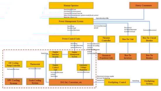 The battery power system includes two packs of batteries, located on port and starboard sides of the case study ferry. The battery power plant on the vessel comprises two identical battery packs connected to the direct current (DC) hubs and through the power module (DC/alternating current (AC convertors) they can provide energy to motors, driving propellers and thrusters, and hotel loads. The battery packs will be charged while in port from local grid power or existing auxiliary power supply in the shore changing station. The capacity of a Wartsila approved battery pack is 653 kWh and the output voltage ranges from 672 to 896 V. There are two battery packs onboard (port and starboard). To identify the hazards among the battery system, the systems of innovative battery and conventional engine power plant are simplified as shown in Figure 4 and Figure 5. Inside the dash line area, the deviations between two power plants are highlighted so that the risk assessment will be focused in these components.