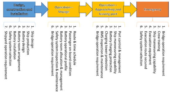 The scope of this study will be confined and confirmed so that the risk assessment directly evaluates the most concerned issues to the stakeholders. Figure 6 presents the scopes of the risk assessment including mainly three phases: (1) design, construction and installation; (2) operation: voyage and approaching/leaving port; and (3) emergency situations. Different activities will be considered while assessing these phases. In this study, the first phase will take into account of ship design, ship production processes, battery design, battery room arrangement (in a general ship arrangement), battery installation and operation in the shipyard. Phase two will mainly focus on the operational activities so the route and schedule, load case conditions, operational profile, arrangement, maintenance and crew operations will be under consideration. In the last phase, the operation during emergency will be evaluated including crew operation, training, manoeuvring capacity, evacuation route, lifesaving equipment and safety systems (fire suppression and fire alarming systems).