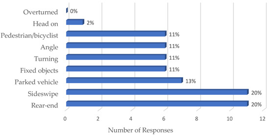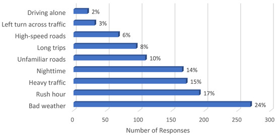 Rankings of survey responses on driving condition, mobility difficulty, driving ability impairment, near-crash, and risk circumstances were listed in Figure 1, Figure 2, Figure 3 and Figure 4. The results showed that bad weather, rush hour, and heavy traffic are the top unfavorable driving conditions that older drivers tend to avoid. These driving conditions were considered challenging because they demand increased attention and quick response in comparison to clear weather, non-rush hour, and free-flow conditions. Slow reaction time, stiff joints/muscles, and vision impairments were the top driving ability impairments reported by survey respondents, which are all related to the aging physical conditions of older people. Rear-end and sideswipe were the most-reported collision types that older drivers encountered, which may be due to slow reaction time and vision deterioration caused by aging. Headlight glare at night and speed of drivers were the top-reported risk circumstances, which are in alignment with the results from the driving conditions that older people tried to avoid.