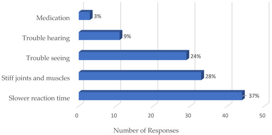 The survey results revealed that although it is common for older drivers to experience difficulty in performing daily activities and are on prescription drug(s), the majority (90%) of respondents still drove 3–5 days or every day in a week. This indicates the strong mobility needs of the older population. Past studies have proved that mobility is of fundamental importance to older adults’ independence, physical and psychological health, and quality of life [34,35,36]. With the advance of technologies and automation of motor vehicles, new safety and operational features (e.g., cameras, sensors, cruise control) have been equipped on vehicles by default, which lowered the bar for older people to drive safely. The trends in older driver crashes have shown that fatal crash involvements for adults aged 70 and older in the U.S. remain down from their 1997 peak, even as the number of licensed older drivers and the miles they drive have increased, which is likely attributed to health improvement and vehicles with improved crash worthiness and safety features [37]. Older drivers with impairments usually self-regulate to reduce their exposure to live traffic. On the other hand, restriction policies and laws are in place to restrict older people’s driving activities based on their ages or impairments (e.g., [38,39]). Although those safety measures are effective in mitigating motor vehicle crashes involving older adults by reducing their exposure to traffic, the focus needs to be placed on providing a roadway network and a traffic control system that considers older people’s characteristics and needs, rather than restricting them from driving. A study from New Zealand has shown that licensing and mobility restrictions policies target all older drivers cannot be justified from a safety basis [30].