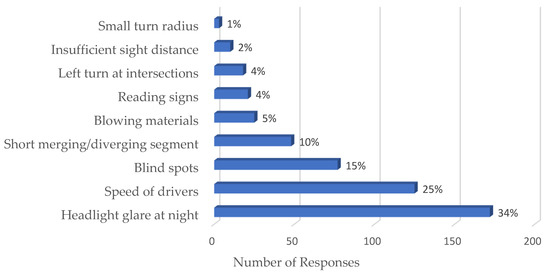 The rankings of responses showed that bad weather, rush hour, and heavy traffic were the top driving conditions older drivers tended to avoid, and rear-end and sideswipe were the top collision types that older drivers encountered. Given that those conditions and collision types are commonly avoided or experienced by young and middle-aged drivers [40], those results did not provide much specific information on mitigating older people motor vehicle crashes. The results on perceived risky circumstances by older drivers provided valuable insights in this regard. Headlight glare at night, the speed of drivers, blind spots, and short merging/diverging segments are the most reported risky circumstance by older drivers. These are related to median design/roadway lighting, sight distance, design speed, and roadway geometry. Therefore, enhanced roadway design that considers older people’s characteristics and speed limit enforcement will improve older drivers’ safety. The finding will provide insights to help bridge the gap identified in previous studies (e.g., [41]) of lacking definitive findings or recommendations for infrastructure changes to increase the safety of older drivers.