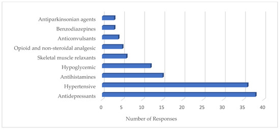 Figure 5 presents the ranking of prescription medicine use reported by survey respondents. Antidepressants and hypertensives were the top prescription drugs used by older drivers, followed by antihistamines and hypoglycemics. Note that an older driver could be on multiple prescription drugs at the same time. The drug-use frequency was not high compared to the total number of responses. Still, the logistic regression model identified prescription drug use as a significant variable, indicating that the adverse impact of medicine on older driver safety cannot be overemphasized.
