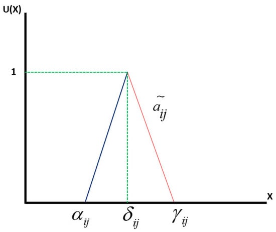 In the first step, relevant experts conducted a survey on a specific topic. Then the fuzzy numbers are generated directly from the experts’ surveys. Fuzzy numbers can be calculated based on triangular or trapezoidal membership functions. In this study, triangular fuzzy numbers (TFNs) are used, and the membership function is introduced according to Equations (1) to (4) and Figure 1 [,].