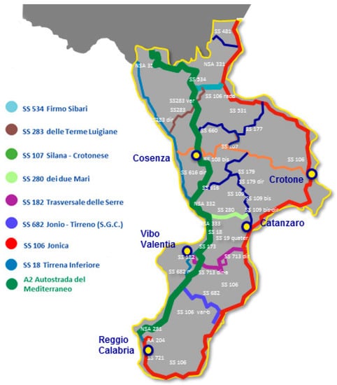 The main road infrastructures of Calabria can be classified into two separate groups: longitudinal and transversal roads. In the first one, there are the road infrastructures that cross the whole region from north to south, in particular: