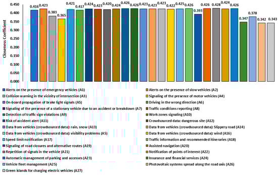As shown in Table 6 and Figure 3, there have been dramatic cuts in the importance of two categories, including Internet services and solar and ecological roads with other categories. Hence, photovoltaic systems spread along the road axis (A26), Green islands for charging electric vehicles (A27), and insurance and financial services (A24) have the lowest ranks, correspondingly. The first smartification action was the repetition of signals in the vehicle (A21) with a closeness coefficient equal to 0.428, which belongs to the traffic category. Then, the five smartification actions from three categories including risk of accident alert (A11), crowdsourced data: dangerous site (A12), traffic information and recommended itineraries (A18), assisted navigation (A20), and automatic management of parking and accesses (A23) achieved the second rank with the closeness coefficient equal to 0.426 among the twenty-seven measures. Finally, these calculations, the ranking of smartification measures of the Calabria’s roads with FDAHP-FTOPSIS is (A21 > A23 = A20 = A18 = A12 = A11 > A17 > A7 = A10 = A22 > A82 = A8 = A13 = A14 = A15> A16 > A5> A9 > A6> A1 > A19 > A3 > A25> A4 > A24> A27 > A26). According to this ranking based on experienced experts’ opinion, the repetition of signals in the vehicle (A21) was considered as the most significant action for smarting roads of the case study. Hence, wireless communications, such as vehicle-to-everything (V2X) communications, can be useful for smarting roads, and it is suggested that prioritizing investment and research in future smart plans be considered for V2I (vehicle-to-infrastructure), V2N (vehicle-to-network), and V2D (vehicle-to-device). Moreover, these three vehicular communication systems can be applied as effective tools for the five smartification actions, which had the second rank in terms of importance and priority. For example, in safety messages, the message of a crash report along the route can increase drivers’ awareness of their route by using A21 and A11. Using A18 and 20 allows users to arrange an itinerary, check for amenities along the road, bookmark important sights, and so on. Furthermore, in-car warnings can use data collection and identification of dangerous road sections to slow vehicles in risky zones by using A12. A23 which can help to alleviate traffic congestion and properly manage parking demand in the Calabria road network, also received a positive evaluation.