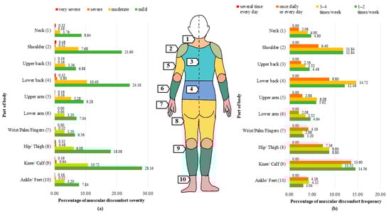 The percentages of (a) severity and (b) frequency of muscular discomfort classified according to parts of the body.
