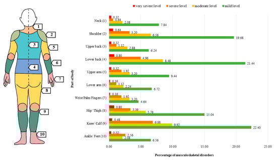 About 70% of the participants reported MSDs in at least one part of their body. Knee/calf, lower back, and shoulder pain were the most frequently reported. The top three areas of the body where MSDs were experienced, with regard to their severity and pain level, were also the knees/calves, the lower back, and the shoulders. This finding concurs with previous Thailand-based studies [5,6,7,20].