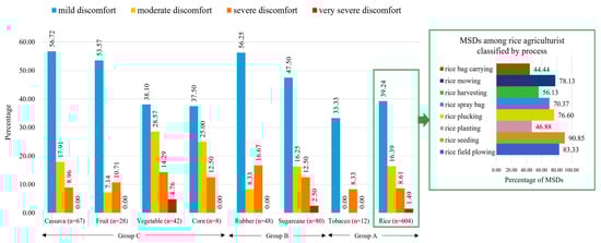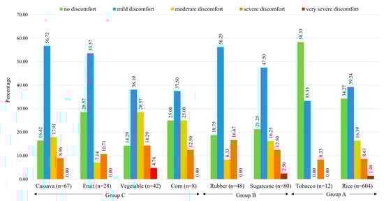 According to the results that are based on the groups and the cultivating types, the workers from group C (cassava, fruit, vegetable, and corn farming) reported the most experience with severe to very severe levels of discomfort, followed by group B (rubber and sugarcane farming). Further details are shown in Figure 3.