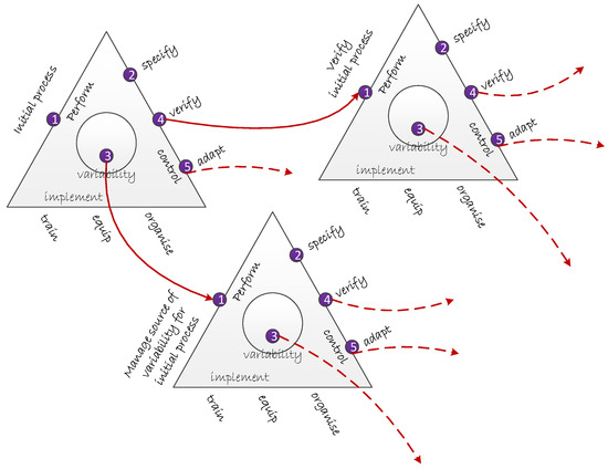 The investigation logic of the SAFRAN method further suggests two possible ways of identifying a function that should be analysed in a further iteration. Firstly, for each of the identified SPV of the initially investigated function, the process that logically would manage this should be further investigated, with the identified SPV as the outcome of the process performance of this process. In such a case, the investigated new function is graphically represented by a new triangle and an arrow, starting from the bottom of a previously investigated function, indicates the link with the identified SPV. Secondly, the process that represents the capability of the system to verify the variability in the performance of the initially investigated function should be further analysed. The link between both functions is represented by an arrow starting from number 4, on the right-hand side of the triangle representing the initial process, towards the left-hand side of a triangle representing the function that verifies variability in the performance of the initial function or process. This logic can then be repeated for each analysed triangle as the starting point for identifying new implementing or control processes for further analysis. The graphical representation of this logic is illustrated in Figure 2 below.