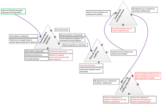 Finally, similar to what Underwood and Waterson [15] conducted to compare the ATSB, AcciMap and STAMP methods, the SAFRAN method was used to analyse in detail the 2007 Grayrigg train derailment as described by the UK’s Rail Accident Investigation Branch in its independent investigation of this accident [16]. This allows for additional comparison, this time also using the SAFRAN method. The analysis of the Grayrigg train derailment formed the capstone of a series of close to 100 similar studies, where the information from publicly available accident investigation reports was ordered in a SAFRAN-logic. Although also investigation reports from other types of transport modes (e.g., shipping and aviation) were analysed, most of the studies were related to the railways, and derailment events, in particular [4,17,18].