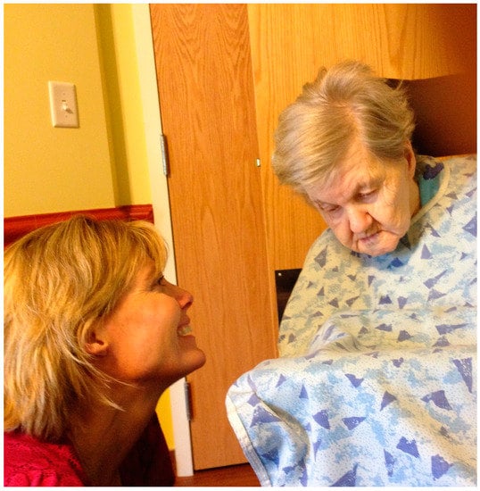 In the summer of 2013, my mother visited my Nanny at Sunrise with my Auntie Sherry and my Uncle Ron just before my Auntie Sherry died of cancer. My uncle brought his guitar and the three sat around their mother and sang “Hey Good Lookin’” over and over to her for nearly half an hour. My uncle’s rough fingers across steel strings in the same pattern. My aunt tapping her fingers on the table. My mother kneeling at her mother’s side. Just before the end of the sixth rendition, my Nanny—who has now lost all ability to speak and is confined to a wheel chair—opened her blue eyes wide and raised a hand towards my mother’s face (See Figure 1).