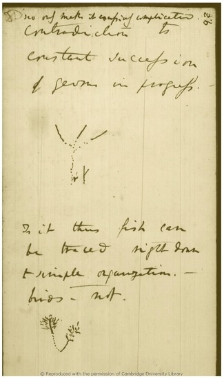 | 5. | After the quoted passage, Darwin drew a first sketch and writes: “is it thus fish can be traced right down to simple organization. birds—Not.”; then Darwin drew a second sketch; see the reproduction of page 26 of the Notebook B, cit. |