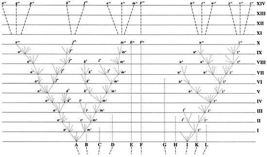 Once again, Darwin presents us with a schematic of a genealogical tree (Darwin 1859–1876, p. 90)7, in which extinction plays a very important role (Darwin 1859–1876, pp. 92–93)8. Furthermore, we can read this graph not only from bottom to top, but also from top to bottom, in order to trace the lines of the supposed progenitor of the living (and also of the extinct) species (Darwin 1859–1876, p. 95). Now, the first general question that we could pose is: what are the mechanisms and forces that explain the becoming of new species, and the extinction of old species in this genealogical diagram? Darwin’s answer is that these processes are the “probable results of the action of natural selection through divergence of character and extinction, in the descendants of a common ancestor.” (Darwin 1859–1876, p. 95).