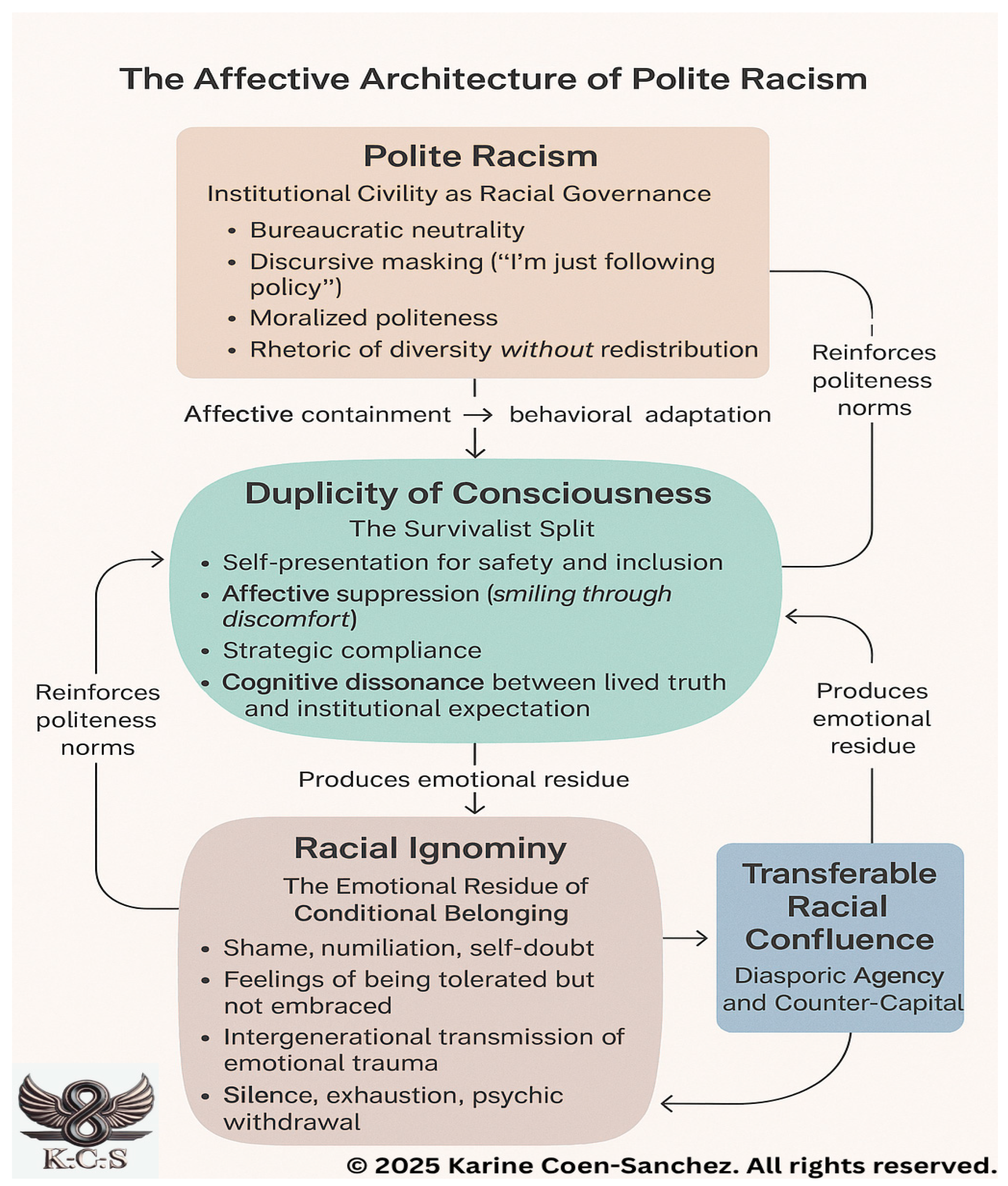 This framework visualizes the recursive emotional, institutional, and behavioral feedback loops that define polite racism as a form of affective governance. It outlines how institutional civility and discursive masking produce internalized behavioral adaptations and emotional dissonance, resulting in racial ignominy. The model also highlights how this affective residue can be transformed into Transferable Racial Confluence—a site of diasporic resistance and counter-capital. © 2025 Author. Used with permission by the author.