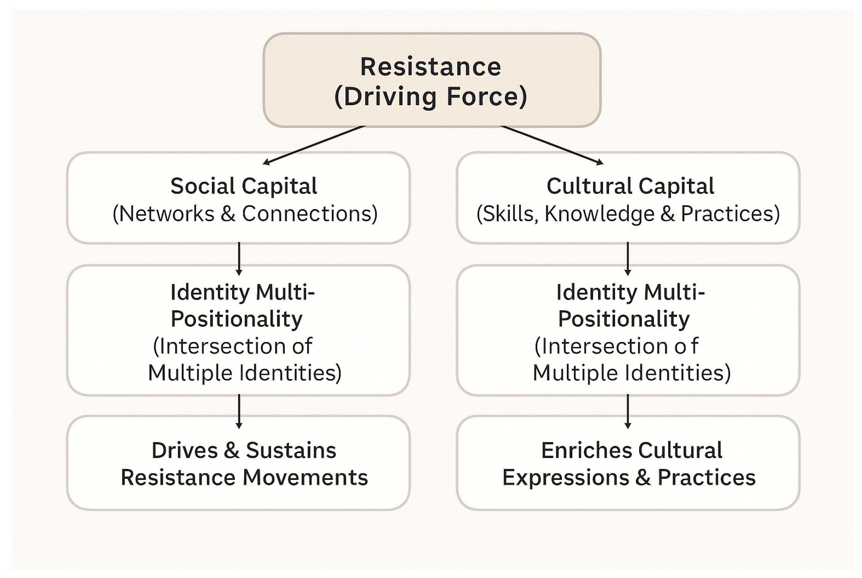 Resistance serves as a driving force that fosters alliances and shapes cultural practices. Identity multi-positionality, referring to the intersection of multiple social identities such as race and class, enhances and enriches both social and cultural capital. Social capital is formed through networks and connections, particularly those strengthened by resistance and the diverse identities within these networks. Cultural capital encompasses the skills, knowledge, and cultural practices that emerge and are enriched through resistance and the intersection of multiple identities.