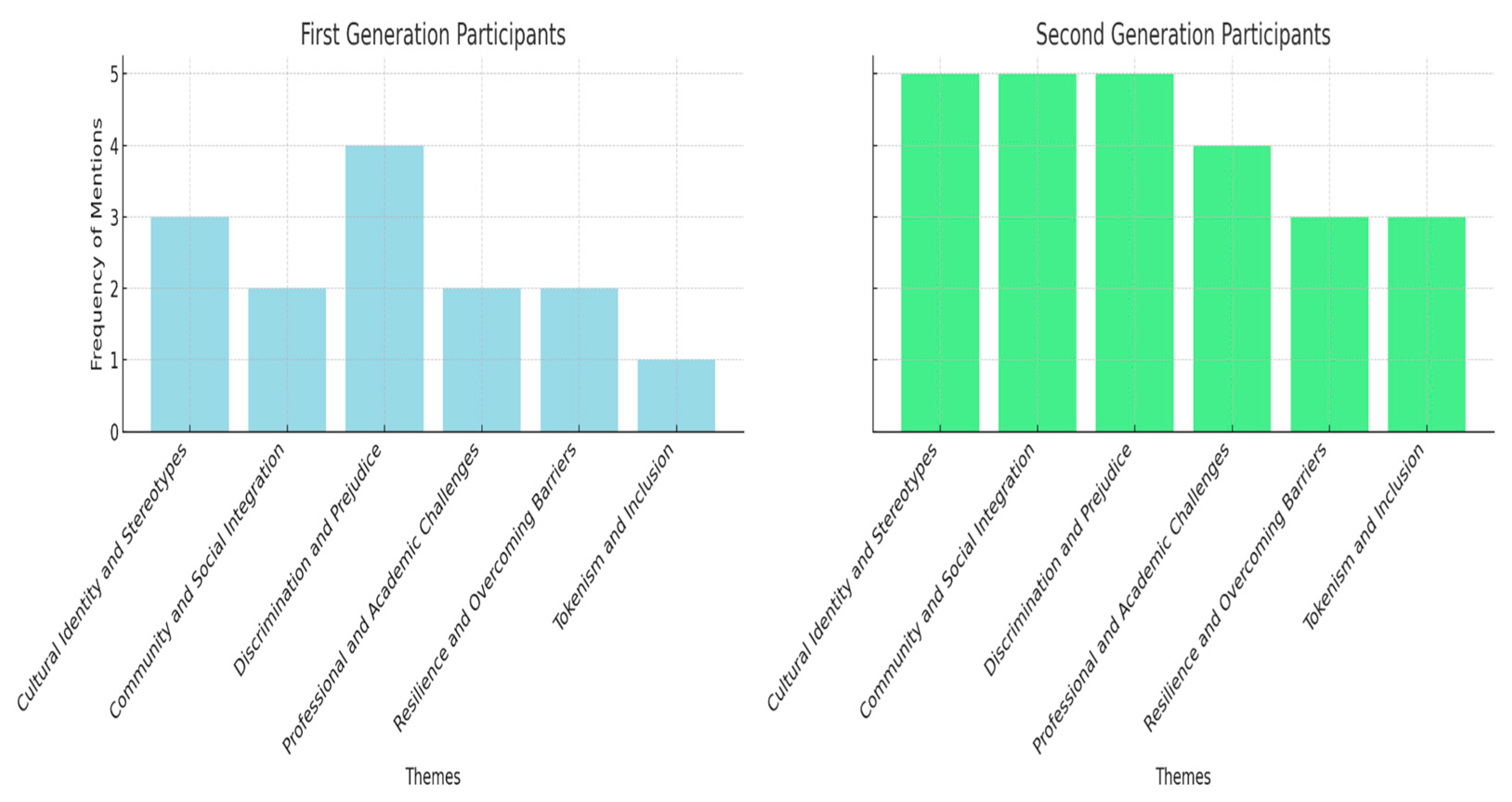 A comparison of the experiences between first- and second-generation participants revealed nuanced differences. First-generation participants focused more on the direct impact of discrimination and the challenges of preserving their cultural identity in a new environment. In contrast, second-generation participants emphasized the ongoing struggle with stereotypes and the importance of community while navigating Canadian society. Despite these differences, both groups highly valued cultural heritage, identity, and supportive community networks.