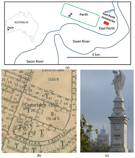 - East Perth Cemeteries Website. 2018. East Perth Cemeteries. National Trust of Western Australia and the Friends of the Battye Library. Available online: http://www.eastperthcemeteries.com.au (accessed on 1 May 2018).