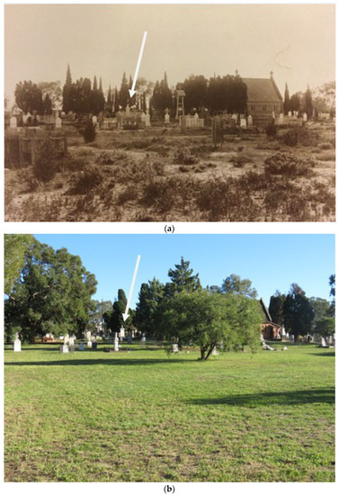 The East Perth Anglican–General Cemetery, looking west from soil graves (foreground and middle ground) toward the brick and vault section (background), and St Bartholomew’s Church. The arrow to the Chipper headstone (d.1886; NT#509) noted in both photographs is for positional reference: (a) Photograph from approximately 1890s (#25024P in the State Library of Western Australia1). The entire area was by then used for burials. Note the uneven ground where burial mounds are apparent; the use of funereal cypress trees; the wooden headboard in the middle ground; and post and rail fences around graves now absent from the cemetery; (b) Approximately the same view in 2017 with the same lack of monuments for burials in the soil graves (foreground and middle ground); note St Bartholomew’s chapel (now a church) lost its Latin cross finials on the roof when it was extended in the 1900s. Photograph by Sandra Hayward (2017).