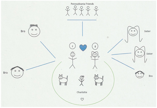Ella and Jamie also were the only participants who included friends as family on their map. Ella explained that this was because friends “are our chosen family and they have taken my siblings’ place since we moved in Pennsylvania”. At another point in the interview Ella also explained that “we had to get a couple of letters of recommendation for the [embryo adoption] process [Interviewer: yeah] we needed a few people to like write us letters [Interviewer: okay] so they knew right away”. Ella and Jamie talked about their friends as a group and they were drawn as a grouped block, without the detailed features that Ella gave to either her siblings or Jamie’s brothers. In response to a question about how their view of their family had changed, Jamie simply said “family matters”. Ella then expanded upon how their view of family had changed with the void left by the double bereavement she and Jamie had experienced with the loss of both sets of their parents: