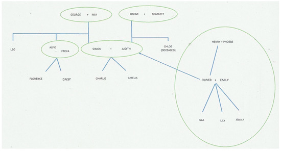 Anne included just her siblings and her husband Jim’s siblings (none with partners) with each sibling depicted in a classic family tree formation with their children. Judith concentrated on accurately representing her husband’s siblings: an elder brother without a partner and a second brother with a partner and two children. Judith also talked lovingly about her sister Chloe who had died of a serious illness whilst Judith was expecting her first child. Judith felt there was a close connection between her daughter Amelia and Chloe: