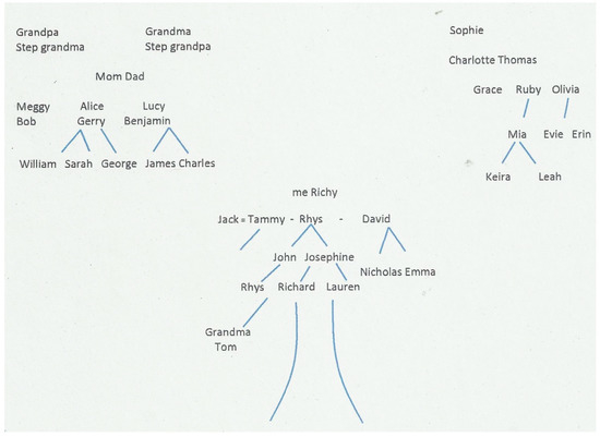 Melissa’s family history was more complex than that presented by other participants. Melissa’s family contained three “biological families”: Tammy (Melissa’s daughter from a domestic adoption) and Melissa’s sons Rhys and David, who were conceived following two separate embryo adoptions. All three of Melissa’s children had contact with their respective biological families. Melissa argued that contact with each biological family (via pictures, messages, and in person) was fundamental to each child’s sense of identity as it gave “that whole sense of family history and similarity”. When describing the occasion when she and her son Rhys met up with his donor family, Melissa said: “They have so much in common. It was really a cool thing to sit down and have dinner and [ask] ‘what are you interested in?’ […] but like the dead-same exact things.” Melissa’s said that all three children’s biological families “feel like family to me” but she said she did not place them on her family tree until she had met them (Figure 3).