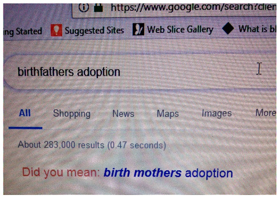 In February 2019, I entered the words “birthfathers” and “adoption” into Google and up came the message “Did you mean “birth mothers” adoption?”. Well, no I did not. See Figure 1.