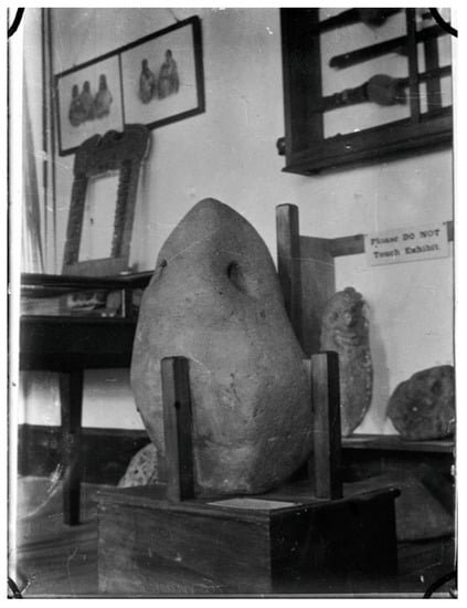 The punga waka (stone anchor) of the waka (canoe) Tokomanu navigated by Manaia on display in 1934 at the Taranaki Museum in New Plymouth. It was one of the original ocean-navigating canoes that settled Aotearoa/New Zealand. Photograph by Albert Percy (1875–1941), courtesy of the Goldberg Collection, Alexander Turnbull Library Collections at the National Library of New Zealand.