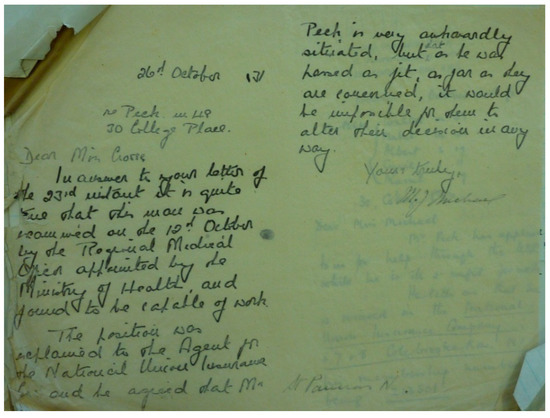 Later that year, in July, the Pecks applied for and were granted funding to cover a replacement for Mr. Peck’s badly fitting false teeth (extensive tooth extraction was quite common at the time (Barnett 2017; Baumgartner et al. 2008)). COS recognised that providing a new set of false teeth could raise self-confidence, and ensure people were more presentable and better able to find work. Additionally that year, Mrs. Peck was given an additional part-time cleaning job in the COS district office. The Peck family’s combined income was only sufficient for a while, however. In Spring 1930, the Peck’s oldest son got married, and the loss of his financial contribution reduced the household’s income. Further, 1931 saw Mr. Peck unwell again between February and October, when he was then pronounced fit for work by the then British Ministry of Labour. Mr. Peck, though, was not regarded as strong enough by his employer: