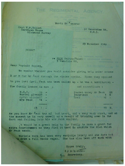 As you know Mr. Peck has a bad heart, and a very weak chest, and at the moment he is very unwell as a result of tripping over in the dark and falling into his air raid shelter. It would be a great help to the family to have a grant for extra nourishment as they find it hard to provide the diet which Mr. Peck needs. Muriels [sic] work has been very variable lately and she does not always draw a full weeks wages. She has also been off work. (23 November 1940)
