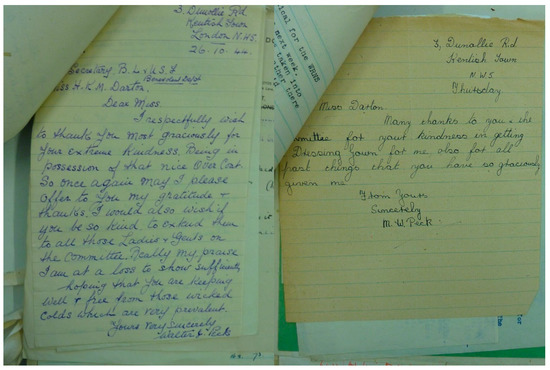 As well as food, clothing was also a recurring problem for the Pecks. Throughout the wartime period, they made applications for clothing, with COS supporting them in approaching, variously, the Regimental Agency, SSAFA, British Legion and United Services Fund. Items requested included a coat for Mrs. Peck, and a suit, boots, jacket and overcoat for Mr. Peck. Muriel was also helped with clothing. In 1942, she applied to join the Women’s Royal Naval Service (WRNS), for which she would need her own dressing gown. COS obtained one for her from the Personal Service League (PSL), a charity with a remit to help ameliorate poverty. Muriel also wrote a letter expressing gratitude (see Figure 3): “Many thanks to you and the committee for your kindness in getting a Dressing Gown for me, also for all past things that you have so graciously given me.” In 1944, COS obtained another overcoat for Mr. Peck. He was very grateful, writing one of many effusive letters that he sent to COS and other charitable societies over the years, thanking them for the help he received (see Figure 3): “… May I please offer to you my gratitude and thanks. I would also wish if you be so kind to extend them to all those Ladies and Gents on the committee” (26 October 1944), as well as often visiting the COS Office to extend thanks in person. The deference and felt lack of entitlement to basic clothing is palpable.