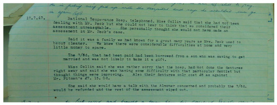 In the summer of 1947, after having some remaining teeth extracted at the National Temperance Hospital (prior to its incorporation into Britain’s National Health Service in 1948), Mr. Peck was experiencing problems. He applied to COS for support. COS approached a number of agencies about help with the cost of replacement dentures, including a charity supporting those who had experienced combat, The Royal Fusiliers Aid Society, who made a grant. During the COS case worker’s investigatory home visit to the Pecks, it also transpired that the Hospital had been charging Mr. Peck for his treatment. To meet the payments, he had borrowed money from his youngest son, Cyril, who was saving to get married. COS took the Hospital to task for their unreasonable assessment of Mr. Peck’s ability to pay for treatment, given that the family had “very little money to spare.” Chastened, the Hospital offered to refund the payment that Mr. Peck had made so far, and the COS Case Officer recorded (see Figure 4):