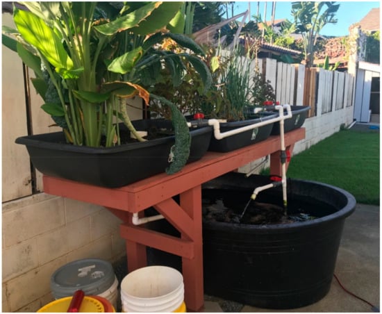 One such effort includes the use of backyard family aquaponics, which models the stewardship and reciprocity found in the ahupua‘a system, a political-geographical land division that encompasses the Native Hawaiian food system. Each of the major Hawaiian Islands are divided into moku, large land districts. O‘ahu, the most populated Hawaiian island, consists of six moku. Moku are further divided into ahupua‘a, which typically extend from the uplands all the way down onto the reefs and into the sea (). The health and aquaculture production of an ahupua‘a’s reefs and coastal fisheries, including loko i‘a (fishponds), are directly tied to the health of its lo‘i kalo (flooded taro agroecosystems) and upland forestry areas (). As a result, there was an understanding that kānaka (people) have the kuleana (responsibility) to maintain the health of each part of the ahupua‘a, ensuring the pono and lōkahi of the entire system. Aquaponics utilizes the symbiotic relationship between fish and plants by effectively combining hydroponics (raising plants in water) and aquaculture (raising fish in tanks) to create a contained, sustainable, food production system similar to the ahupua‘a system (); see Figure 1. By maintaining aquaponics systems, one is able to experience the pilina (reciprocal relationships) between land and sea as well as humans and food.
