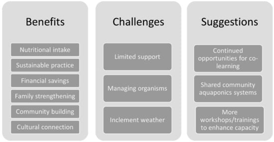 Challenges identified by the participants were related to technical and logistical difficulties, such as managing the plants and fish in the systems and unpredictable weather. Although most studies on community gardening focus on the positive aspects of gardening, our participants readily shared a broad range of their experiences with the mindset that their ideas would enhance efforts related to aquaponics. This may have been due to the strong existing partnership and trust between the community partners and university researchers. As with any project, there is a learning curve with setting up a functional and sustainable system. Our participants willingly shared their struggles with their aquaponics experience and provided thoughtful suggestions.