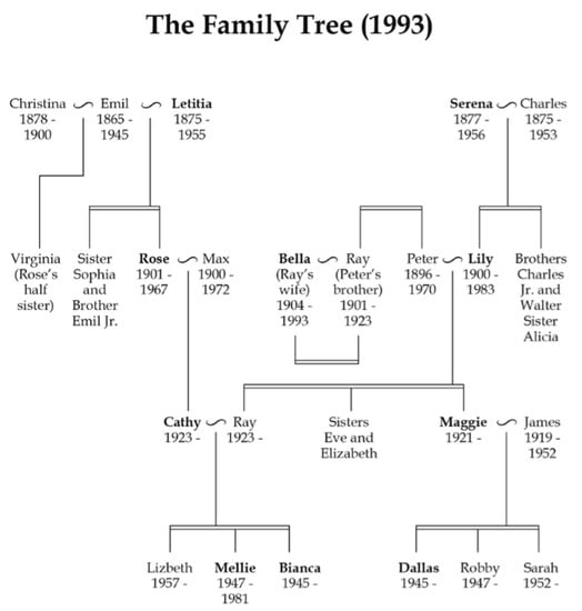 Bella’s Legacy is a fictional family saga, covering four generations in Midwestern America from the late 19th to the late 20th centuries (see Figure 1). Geography was a defining feature in their lives as emphasized by () in her discussion of the profound impact that places have on family history. As she points out, whether staying or moving between places, these locations are as important to family history as dates. The first generation in the book is based on the lives of my great-grandparents, all either immigrants or the children of immigrants originating in Germany, Prussia, Belgium, and Britain. It appears these ancestors all continued traveling without interruption after their arrival on the East Coast, heading to what later became Wisconsin, Michigan (following some years in Canada), Dakota, Minnesota, and Pennsylvania. By the end of the 19th century, when my novel begins, my father’s side of this generation had settled in the Upper Peninsula of Michigan and my grandparents moved from there to rural Northern Wisconsin. They essentially followed opportunities for work with the Soo Line Railroad, where my grandfather, his father, and his father’s younger brother were all railroad men.