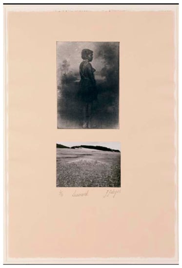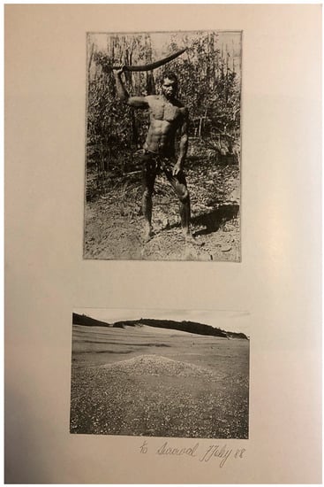 Within her larger body of work, I would like to consider a suite of early works by Foley, which includes an image of an archival image that became an inspiration for Badtjala Woman and Native Blood later in her career (McDonald 2000, p. 43). In 1988, Foley created Survival, I–IV, an etching series of four images on two album pages with 1899 archival photographs of Badtjala people from the John Oxley State Library of the State Library of Queensland. The four simple black and white photo etchings on brown paper recast archival images as personal ones. Resembling pages of a photo album, two different archival photographs of Badtjala people are paired with the same archival photograph of shell middens, or piles of shell refuse, which serve as physical evidence of past peoples for anthropologists (Sinclair 1990, pp. 65–68). Matted together, Survival I–II appear as two works rather than four, with the images of Badtjala people reconnected to the midden piled beach, indicating the mutuality of the relationship between people and country. See Figure 1 and Figure 2.