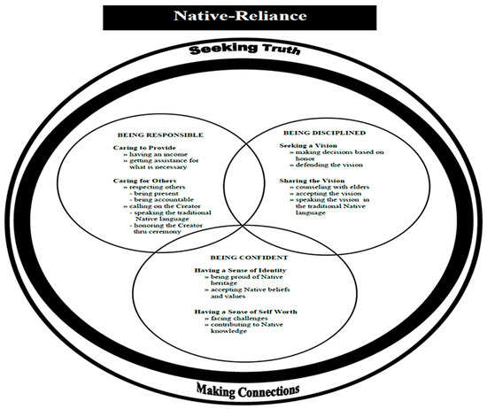 The Native-Reliance theoretical framework and model guided this study by providing a cultural perspective and foundation from which to examine alcohol and drug use prevention among urban Native American youth in a meaningful way. Native-Reliance is conceptualized as a continuous, yet all-encompassing process representing the holistic worldview of Native American ways of knowing and being, cultural identity, health perspectives, and well-being (Lowe 2017). Three internally linked circles and cultural themes (core qualities) of being responsible, being confident, and being disciplined embody the interrelationship between the overarching cultural domains of seeking truth and making connections. The Native-Reliance theoretical framework and model has guided several intervention studies (Lowe et al. 2016, 2019; Patchell et al. 2015). The Native-Reliance theoretical framework posits that when Native American people remain faithful to their own cultural practices, they exhibit behaviors consistent with healthy living through resources that support wellbeing (Lowe 2017; Lowe et al. 2012, 2019). Figure 1 depicts the model as an interrelationship of the three core qualities and two cultural themes of Native-Reliance Theory and guiding framework.